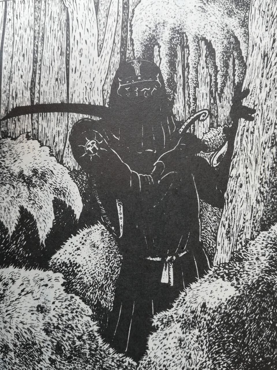 そんなことを考えながら森の中を進んでいくと、とつぜん目の前に黒装束をまとった背の高い男が立ちはだかった。